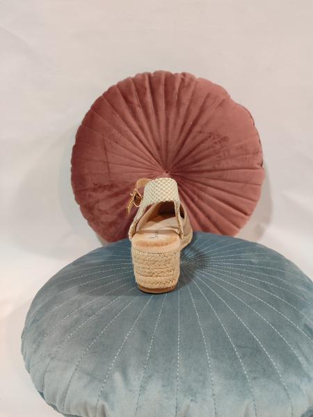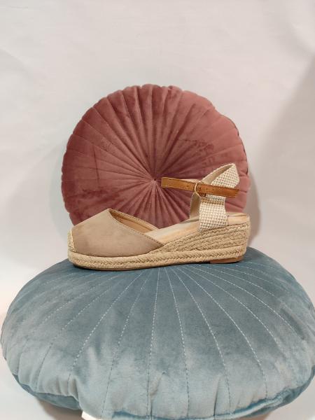 Confeccionada en materiales suaves de tonos neutros , combina una puntera cerrada en ante beige ,talón tejido en color natural y una cuña forrada en yute trenzado que aporta a la CUÑA AMOR un toque rustico y elegante .La pulsera ajustable con hebilla garantiza un ajuste seguro y femenino .Perfectas para paseos ,vacaciones o el día a día